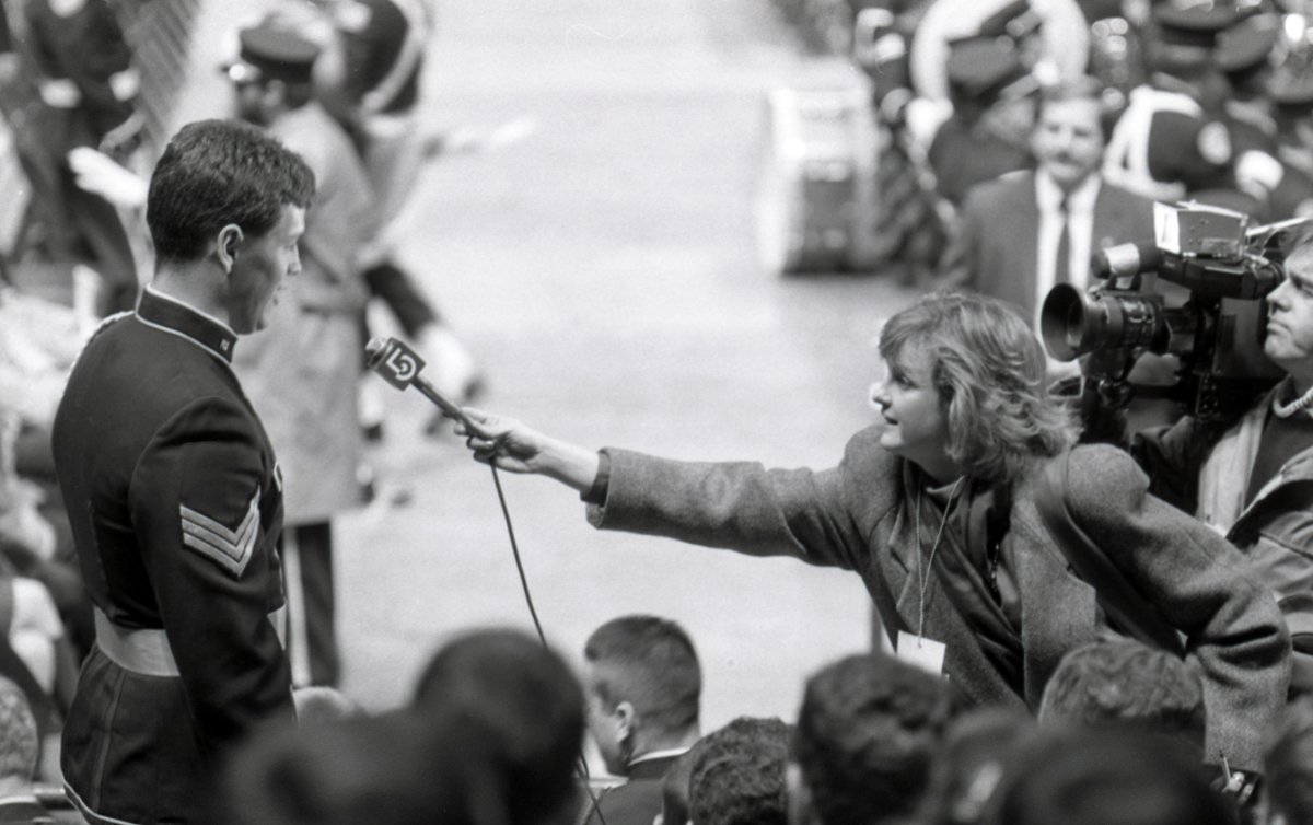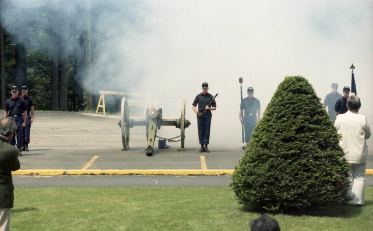 Four graduating seniors posing with a guest during commencement celebrations at Norwich University in Northfield, Vermont, in 1986; at right include David A. Lewis and Dana Scot Keene.